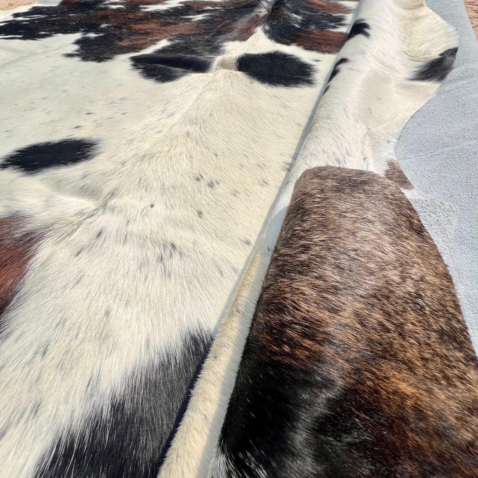 Add a touch of rustic and natural elegance to your home with this spectacular authentic cowhide carpet. Each piece is unique, with a natural tricolor pattern that brings character and distinction to any space.